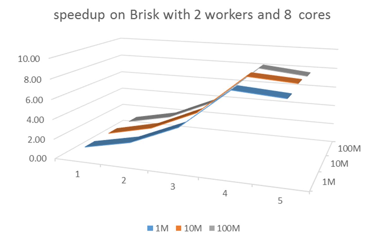 On the Brisk implementation we see greater scalability due to the fact that it is a cluster implementation.  The Brisk implementation was able to handle the 1M, 10M and 100M data set sizes while the total core count was only 8.   The maximum speed-up was around 8 and that was achieved with 16 partitions. In fact, the speedup curves were so close to each other they could not be plotted in 2D.