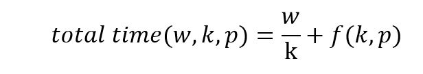 There are really two parameters that increase opportunities for parallel computation in Spark.   One is the total number of available cpu cores and how they are distributed over worker servers.   The other parameter is how we have partitioned the RDDs.   If we let k be the number of partitions of the data and let W be the amount of total time needed to execute the program when k = 1. If k is less than the number of available cores to do the computation and if the work divides up perfectly, the time to complete the execution will be W/k. This assumes that one cpu core is available do to the computation on each of the k partitions. However, work does not divide up perfectly. Reduction operations require data shuffling between workers and task scheduling overhead increase as k increases.   If we assume that overhead is a function of k and the number of available cores p, f(k,p), then the total time will be