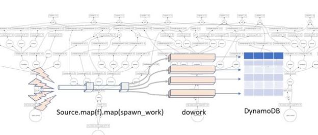 In the picture we have a stream called Source which gathers the events from external sources. We then map it to a function f() for initial processing. The result of that step is sent to a function called spawn_work which creates a future around a function that does some deep processing and sends a final result to an AWS DynamoDB table. (The function putintable(n) below shows an example. It works by invoking a slow computation then create the appropriate DynamoDB metadata and put the item in the table “dasktale”.)