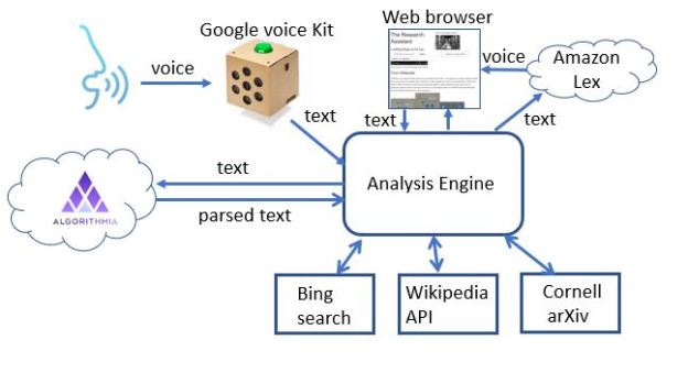 Our scenario is a researcher sitting near the device and asking about very specific research topics such as “physical models of immune response” or “programming a topological quantum computer”. We assume the user wants a spoken response if that response is simple, but we also realize that this is impractical if the system is creating a list research journal papers. To address this issue, the system also has a display in a web browser. (We note that the Cortana and Google assistant do the same if the response is a list.)