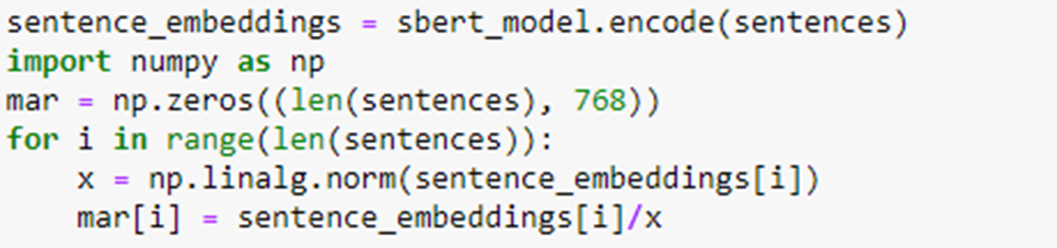 The next step is to use the model to encode all of the sentences in our list. Once that is done, we create a matrix mar where mar[i] contains the sentence embedding vector for the ith sentence normalized to unit length.