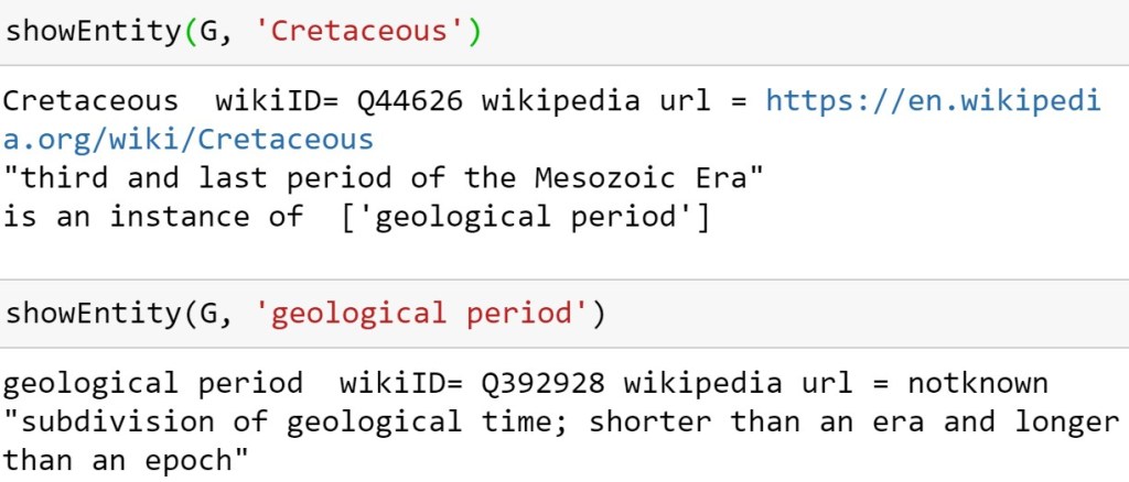 The Google KG is extremely general, so it is not as good for all science queries, especially those that clash with popular culture. For example, if you search for the term that describes the surface of a black hole, an “event horizon” you get an image from the bad 1997 movie by that name. Of course, there is also a search engine link to the Wikipedia page describing the real scientific thing. Among the really giant KGs is the Facebook entity graph which is nicely described in “Under the Hood: The Entities Graph” by Eric Sun and Venky Iyer in 2013. The entity graph has 100+ billion connections. An excellent KG for science topics is the Microsoft Academic graph. See “Microsoft Academic Graph: When experts are not enough” Wang et.al. 2019 which we will describe in more detain in the last section of this note. In its earliest form the Google’s KG was based on another KG known as Freebase. In 2014 Google began the process of shutting down Freebase and moving content to a KG associated with Wikipedia called Wikidata. We will use Wikidata extensively below.