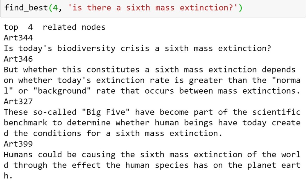 Which is a reasonably good answer drawn from our small selection of documents. However there are many instances where it is not as good. An important thing to note is that we have not used any properties of the graph structure in this computation.
