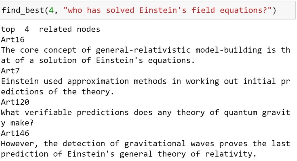 Both fail on addressing the issue of “Who” (several people are mentioned that answer this question are in the documents used to construct our KG.). However the convolutional version find_best2 addressed “solve” “field equations” better than find_best.