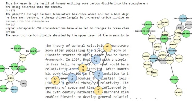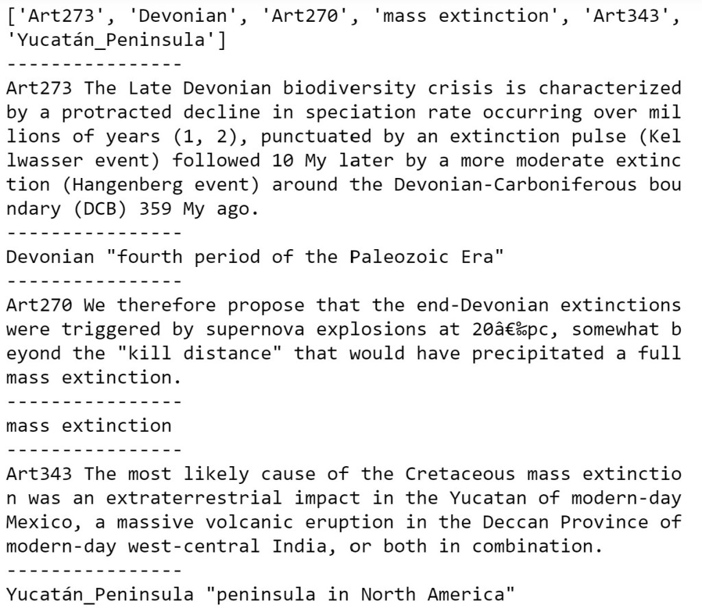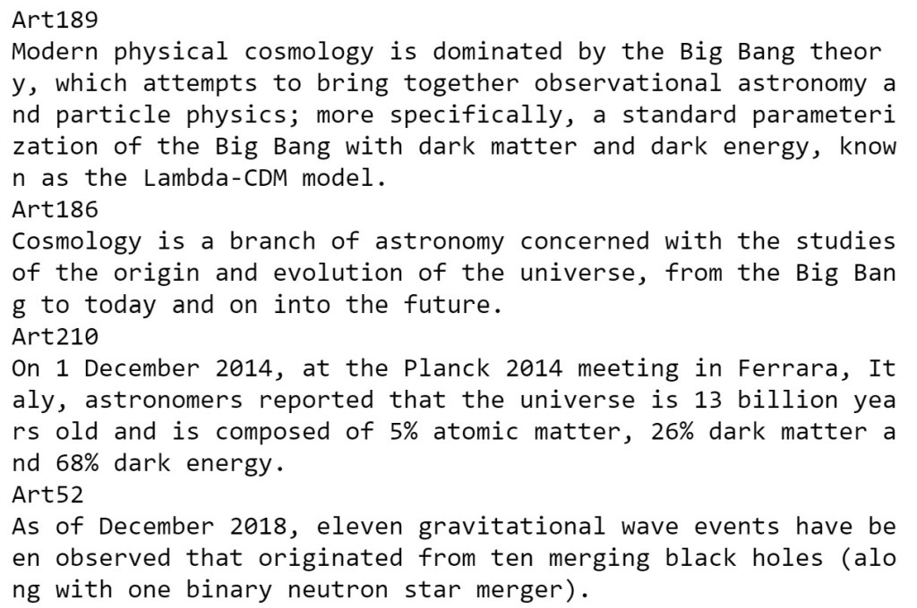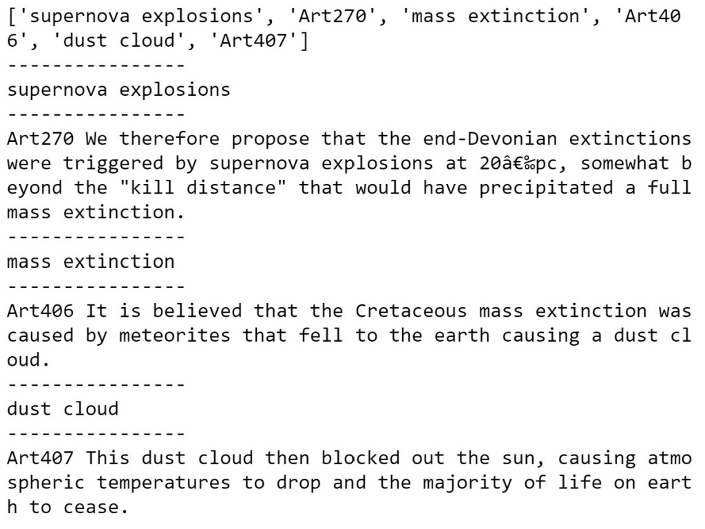 We will build our tiny KG from 14 short documents which provide samples in the topics climate change, extinction, human caused extinction, relativity theory, black holes, quantum gravity and cosmology. In other words, our tiny KG will have a tiny bit of expertise in two specialized: topics relativistic physics and climate driven extinction.