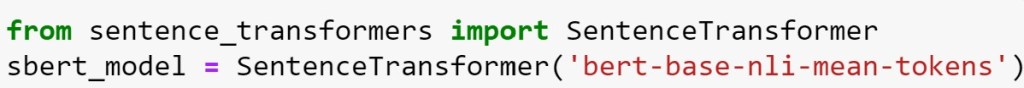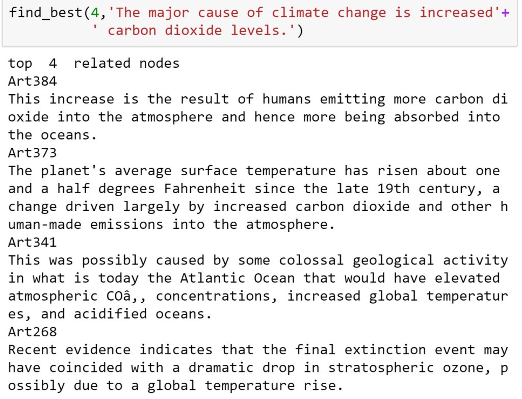 Our tiny KG graph was built with articles about climate change, so it should be able to consider queries like ‘The major cause of climate change is increased carbon dioxide levels.’ And respond with the appropriate related items. The standard way to do this is to take our library of text articles stored in the KG and build a list of sentences (or paragraphs) and then use a document embedding algorithm to map each one to a vector in RN for some large N so that semantically similar sentences are mapped to nearby vectors. There are several standard algorithms to do sentence embedding. One is Doc2Vec and many more have been derived from Transformers like BERT. As we shall see, it is important that we have one vector for each article node in our KG. In the example illustrated in Figure 3, we used two sentences for each article. Doc2Vec is designed to encode articles of any size, so 2 is fine. A newer and more accurate method is based on the BERT Transformer, but it is designed for single sentences but also works with multiple sentences. To create the BERT sentence embedding mapping we need to first load the pretrained model.
