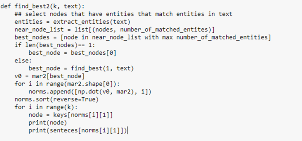 Intuitively the new embedding captures more of the local properties of the graph. We create a new function find_best2 which we can use for question answering. There is one problem. In the original find_best function we convert the query text to a vector using the BERT model encoder. We have no encoder for the convolved model. Using the original BERT encoder didn’t work… we tried.) We decided to use properties of the Graph. We asked the Google NER service to give us all the named entities in our question. We then compare those entities to entities in the Graph. We search for the article node with the largest number of named entities that are also in our query. we can use the convolved mar2 vector for that node as a reasonable encoding for our query. The problem comes when there is no clear winner in this search. In that case, we use the article that find_best says is the best fit and use that article’s mar2 vector as our encoding. Pseudo code for our new find_best2 based on the convolution matrix mar2 is