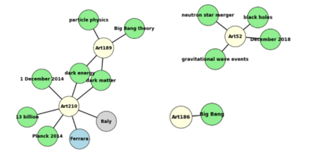 It is an amusing exercise to look at the subgraph of our KG that is involved in the answer to a query. It is relatively easy to generate the nodes that connect to the article nodes that are returned by our query function. We built a simple function to do this. Here is a sample invocation.