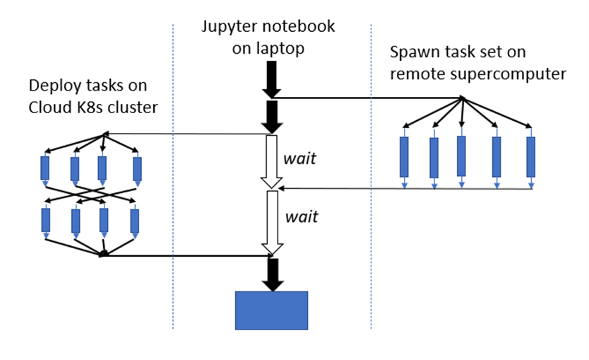 Figure 1. Hypothetical parallel distributed workflow involving remote resources managed from a Jupyter session on a laptop.