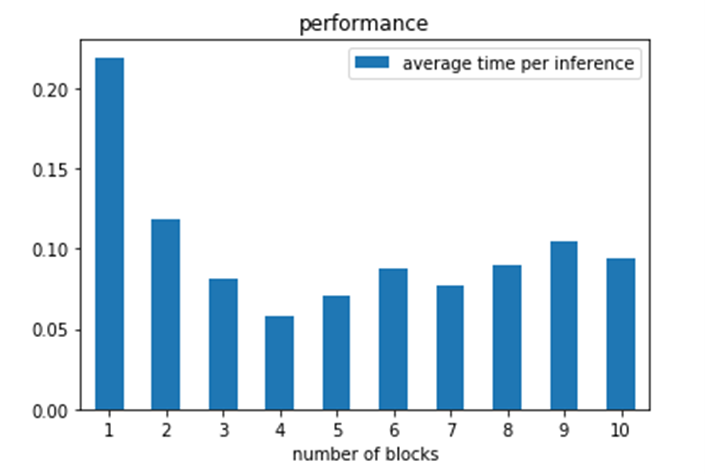 Looking at the actual measured inference time from the experiments above we see the average time per inference in the graph below.