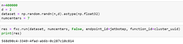 The Nvidia Jetson Nano is a tiny, but powerful computer for embedded applications and AI. It has a Quad-core ARM Cortex-A57 MPCore processor, 128 NVIDIA CUDA® cores and 4GB memory. Installing a FuncX end point on the Nano is easy. Just follow the steps in the docs. At the end of the installation, you will have the endpoint uuid. An important application of FuncX is to use it to probe an edge device and read instruments or use special features that the device provides. Because the Nano has an Nvidia GPU (and my laptop doesn’t) why not ship computation to the nano? Here is a trivial example. KMeans clustering is a standard ML algorithm that clusters points in space into a given number of nearby sets. KMeans also involves lots of vector operations so it is suitable for execution in a GPU. We have a program kmeans.py that contains four functions: