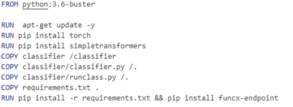 The model along with the python code that will load data and do the classification was saved in a directory “classifier”. To build the Docker container we will run on the cluster we need to start with a container with a good Python 3 implementation. Next we have to install the torch and simpletransformers library and our classifier directory are loaded and we copy the classifier.py program to the root level. Next we need to install the funcx-endpoint code. The complete Docker file is shown below.