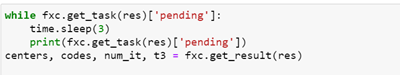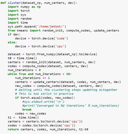 There are two important points to notice here. First is that we must import all the needed libraries inside the scope of the function because they may not be available in the worker execution environment on the remote host. Second, we note that we need to import the three additional functions from kmeans.py which is stored as the file “/home/jetbot/kmeans.py” on the remote machine. The inputs to the cluster function consist of the array of data, the number partitions and a Boolean flag which signals to use the GPU or CPU to do the computation.