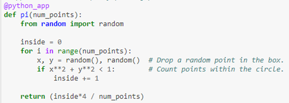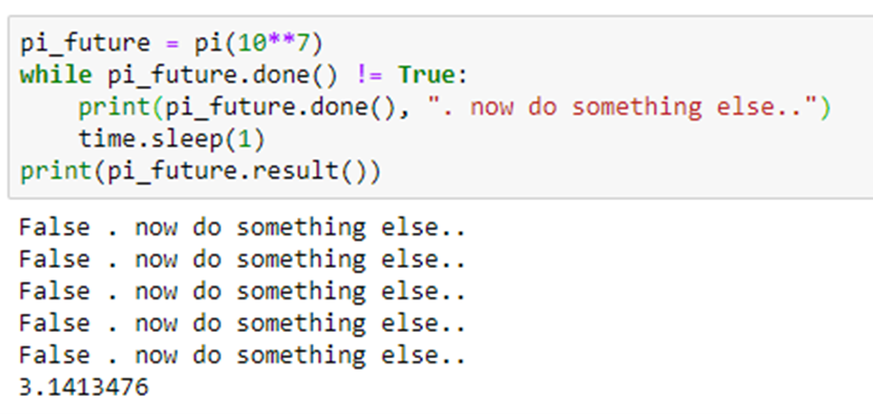 The decoration @python_app indicates that this function will return a future. We can check to see if the computation is complete by calling done() on the future object. When done() returns true we can get the result value with the result() function.