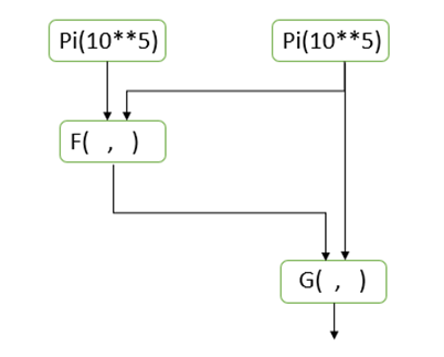 Parsl will allow functions returning futures to be composed into graphs that can be scheduled and executed in “dataflow” style. For example if we have to additional functions F(x,y) and G(a,b) that return futures then the graph in Figure 2