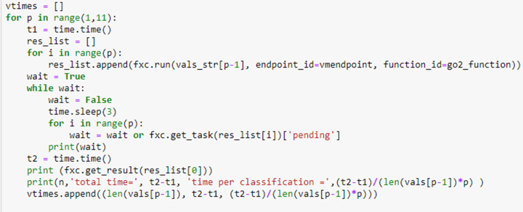 If you divide a fixed number of independent tasks between P processor in parallel the the total time to execute them should drop by a factor of P. Let’s check that with our classifier. We consider our set of tasks to be 250 document abstracts. We have created an array of document indexes called vals_string. Vals_string[ n-1] contains 250/n of the documents for n in the range 1 to 10. In the code below we launch p instances of our funcx_impl2 each working on vals_sting[ p – 1]. Then we wait for them all to finish. We do this with p in the range of 1 to 10.