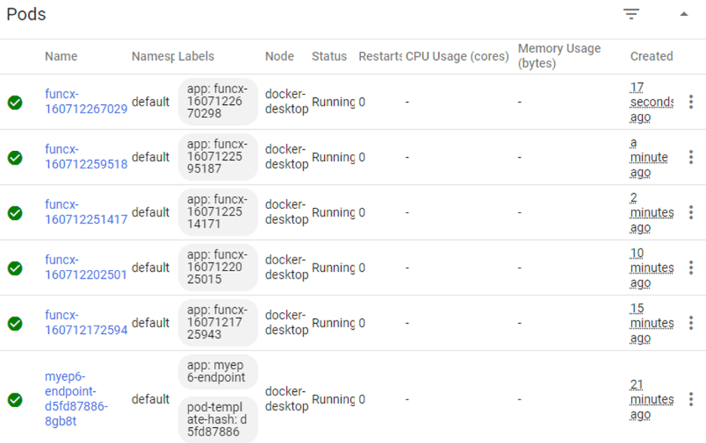 Now that we have our Kubernetes cluster, we can run many invocations of this function in parallel and see how it performs. The cluster we are using has only five nodes, each with 2 cores, but only one copy of the container can fit on each node. One of the beauties of FuncX is that when it gets to many request it automatically spawn a new worker (which are called Pods in Kubernetes). Using the Kubernetes dashboard we can see what it looks like when we have the system loaded with parallel requests.
