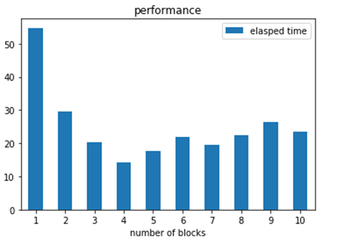 Figure 3. Dask (orange) vs Parsl (blue) execution time for block sizes 1, 2, 4, 5, 10, 20, 100.