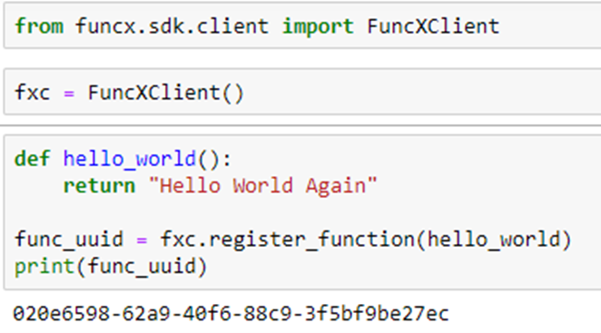 FuncX is a FaaS fabric that is designed for science. Technically, FuncX is not a serverless platform. FuncX requires that the user acquire or deploy the physical resources needed. To submit a function to the resource you need an instance of the FuncX client and an endpoint string which is the key to the host resource. To create an instance of the FuncX client and bind a function to it, you simply do the following.