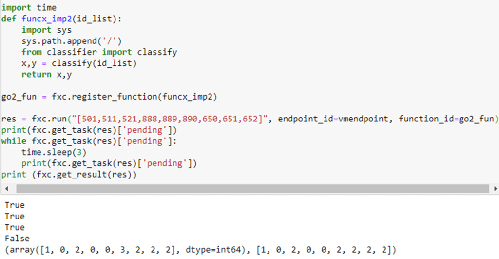 which returns 2, the correct classification (Physics). (The true and false values are results from the pending queries.) To do the performance evaluation we will use the other function which allows us to send a list of document ids. This makes us able to send longer lists (because FuncX has a limit on the size of messages). The following is an example.