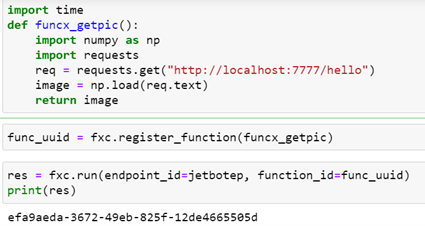 The Jenson board has a camera, so as an experiment, we decided to write a function which will capture an image from the camera and return it to display. Unfortunately, this camera requires a complex initialization and only one process can initialize and own the camera at a time. But FuncX allows multiple instances of a function to execute concurrently, so we need some way to mediate access to the camera. The solution was to create a simple miro-web service that runs continuously. It initializes the camera and has a single method “hello”. Invoking that method causes the service to grab an image and store it in a file. The path to the file is returned to the FuncX function that can grab the file and return it to the caller. In this case the function is now very simple. The camera service is waiting on a port on the local host where the function is executing. The local file is read and the image is returned.