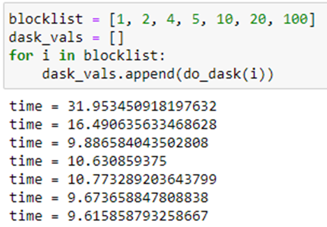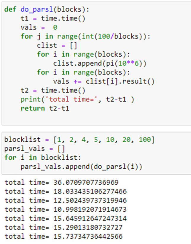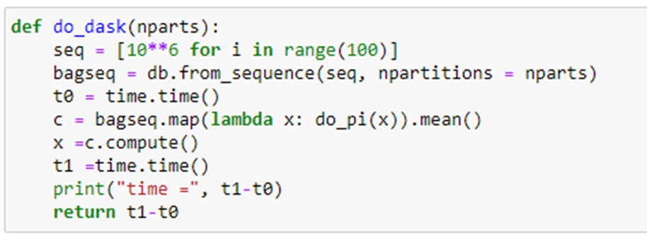 In many ways Parsl is like Python Dask (which we wrote about in a 2018 blog article.) Dask is heavily integrated into the python stack. Numpy and Pandas smoothly interoperate with Dask. For the embarrassingly parallel bag-of-tasks applications Dask has a feature called dask.bag (db below). We can compare Dask on the same 8 core Azure ubuntu machine that we used above. We create a list of 100 copies of the value 10**6 and create a bag sequence from this. We partition this bag into “nparts” partitions and invoke it in parallel as follows.