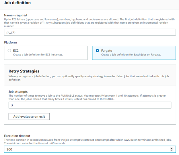 Once we have a job queue, compute environment now all we need from the portal is a job definition.  We give it a name, say it is a Fargate job.  Specify a retry number and a timeout number.