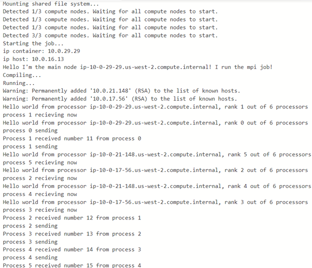 Running MPI parallel job on AWS with the Batch scheduler is actually easier than running the Batch workflows.   The following is based on the blog Running an MPI job with AWS ParallelCluster and awsbatch scheduler – AWS ParallelCluster (amazon.com).   We use the Parallel cluster command pcluster to create a cluster and configure it.  The cluster will consist of a head node and two worker nodes.  We next log into the head node with ssh and run our MPI job in a manner that is familiar to anyone who has used mpirun on a supercomputer or cluster.