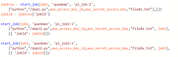 In our example we have two containers,  “dopi” and “dopisecond”.  The first container invokes “dopi.py” with three arguments: the two AWS keys and a file name “FileXx.txt”.    The second invokes “dopi2.py” with the same arguments plus the jobname string.  The second waits for the first to terminate and then it reads the file and modifies it saves it under a new name.  We invoke the first and two copies of the second as follows.