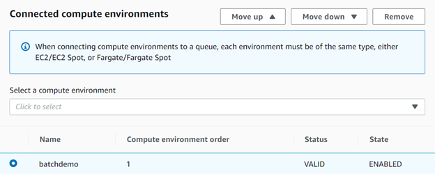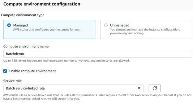 1. The Compute  Environment which describes the compute resources that you want to make available to your executing jobs.   The compute environment can be managed, which means that AWS scaled and configures instances for you, or it can be unmanaged where you control the resource allocation.   There are two ways to provision resources.   One is AWS Fargate (the AWS serverless infrastructure build for running containers) or on-demand EC2 or spot instances.  You must also specify networking and subnets.