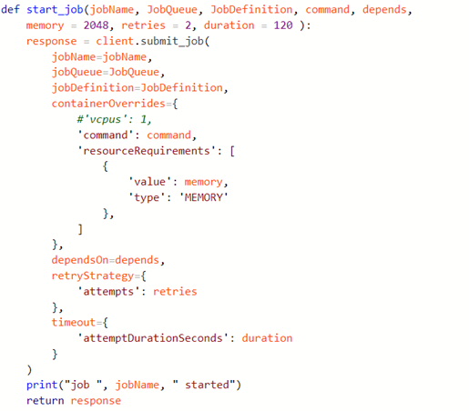 Defining and managing the jobs we submit to batch is much easier if we use the AWS Boto3 Python API. The function below wraps the submit job function from the API.