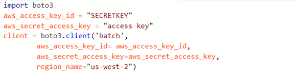 In our example the container runs a program that writes and reads files to AWS S3.   To do that the container must have the authority to access S3.   There are two ways to do this.  One is to use the AWS IAM Service to create a role for s3 access that can be provided to the Elastic Container Service.   The other, somewhat less secure, method is to simply pass our secret keys  to the container which can use them for the duration of the Task.   The first thing we need is a client object for Batch.  The following code we can execute from our laptop.  (note: if you have your keys stored in a .aws directory, then the key parameters are not needed.)
