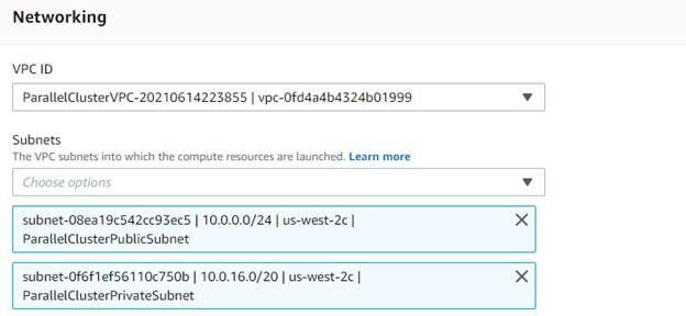 Finally we need to setup the networking.    This is tricky.   Note that the portal has created you Batch compute environment in your current default region (as indicated in the upper right corner of the display).  In my case it is “Oregon” which is US-west-2.   So when you look at your default networking choices it will give you options that exist in your environment for that region as shown below.   If none exist, you will need to create them.   (A full tutorial on AWS VPC networking is beyond the scope of this tutorial.)