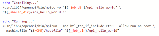 Note that the submit script wants to find the C program in the /shared directory.  The hello world program is identical to the one we used in the Azure batch MPI example.  The only interesting part is where we pass a number from one node to the next and then do a reduce operation.