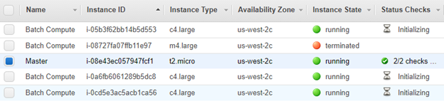 This will take about 10 minutes to complete.  You can track the progress by going to the ec2 portal.  You should eventually see the master node running.  You will notice that when this is complete that it has created a Batch jobqueue and an associated ec2 Batch compute environment and job definitions.