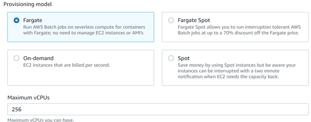 Next we will provision it by selecting Fargate and setting the maximum vCPUs to 256.