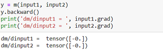 We can directly compute the gradient using basic automatic differentiation in Torch.  When we evaluate the partial derivatives for these values of input1 and input2 we see they are zero.