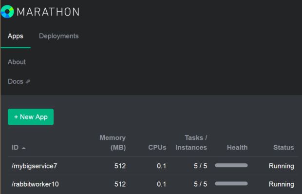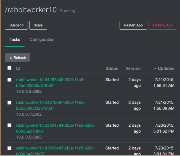 If you now go to the Mesosphere web page for your cluster you can go to the services page and you should see marathon running at the bottom. Clicking on marathon should show you the current microservices that marathon is current managing. Shown below is my cluster. I have two microservice types and each is running with 5 instances. Clicking on the name of your service will bring up details as shown below for my rabbitworker10 (a name change for rabbitservice … sorry for the confusion).